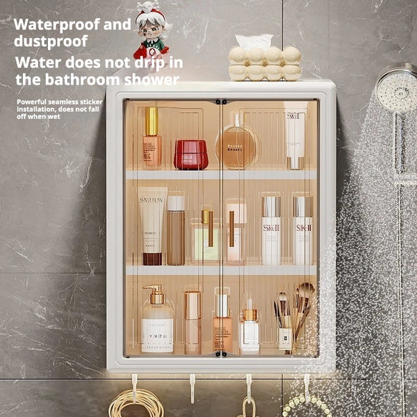 Yes. Made from waterproof PET material, the shelf wipes clean with a damp cloth and mild soap, keeping cosmetics and bottles free from mold and grime.
